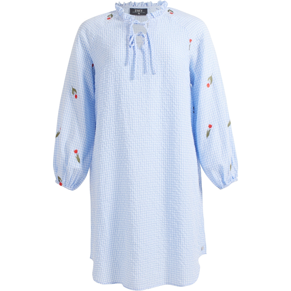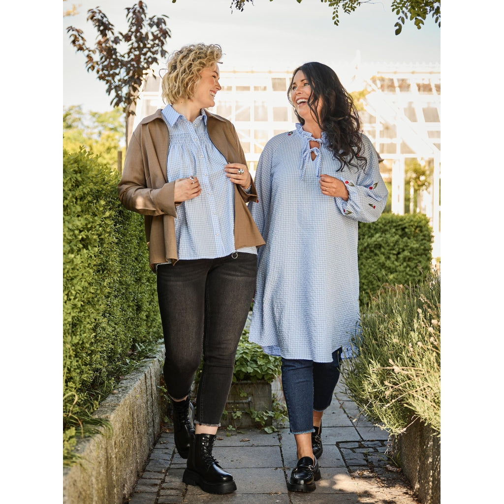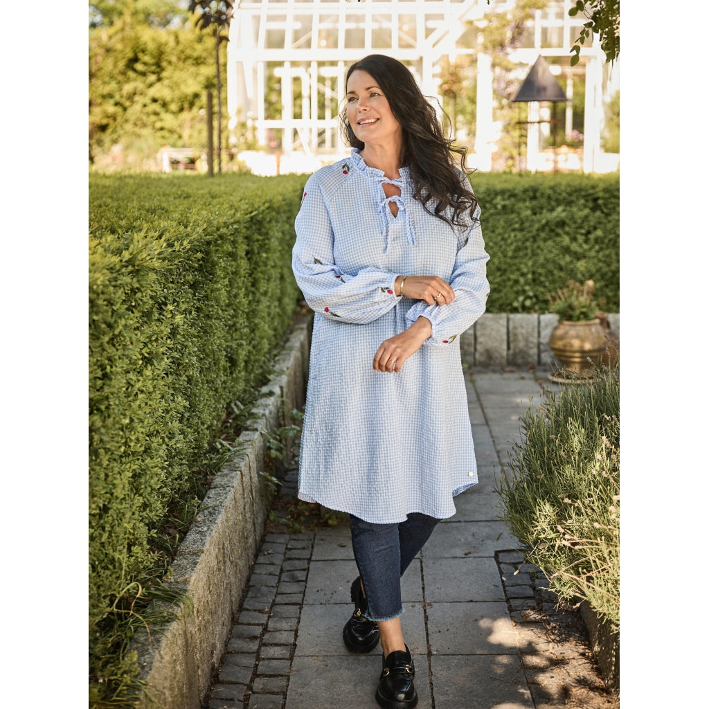 Die Jill Tunika überzeugt mit romantischen Details wie Rüschenkragen, Bindebändern und floralen Stickereien. Die Länge unter dem Knie macht sie vielseitig tragbar.Highlights:Karierter StoffRüschenkragenFlorale StickereienElastische ÄrmelLänge unter dem Knie
